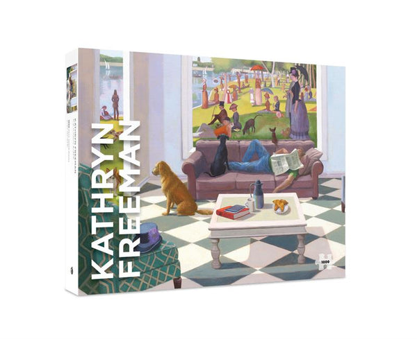Kathryn Freeman applies her unique perspective to this iconic work of pointillism with a playful blending of modern and classic. Freeman credits Georges Seurat’s A Sunday on La Grande Jatte as a major influence on her painting development, and it's an image she returns to repeatedly for inspiration. Elements of this much admired masterpiece seep into Freeman's modern living room filled with loyal dogs, coffee, and a long read of the weekly paper. Sunday, after all, is fun day.