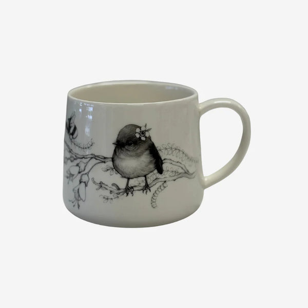 ‘So this is love’ features a male and female miromiro | tomtit pair, lovingly glancing at one another as they perch themselves amongst some flowering native puawānanga/clematis paniculata. They are also joined by a friendly pīrorohu/bumblebee. Miromiro/tomtits are charming little songbirds native to Aotearoa/New Zealand, known for their striking plumage and sweet, high-pitched calls. These birds often live in monogamous pairs, forming strong bonds that can last through multiple breeding seasons. During nesting, the male tomtit takes great care of his mate while the female stays on the nest to keep the eggs warm, the male brings her food like insects to help her stay strong. He stays nearby, often singing and watching for danger. After the chicks hatch, he helps feed them, working together with the female to raise their young. It's a beautiful example of teamwork in nature!